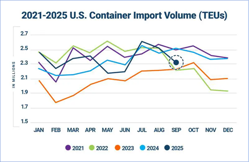 航運界網(wǎng)消息,Descartes數(shù)據(jù)顯示,2025年9月,美國集裝箱進(jìn)口量環(huán)比下降8.4%至約230.8萬TEU。這進(jìn)一步證實,由于特朗普2.0關(guān)稅政策的不確定性,美國主要港口的集裝箱進(jìn)口量在年底前將穩(wěn)步下降。
