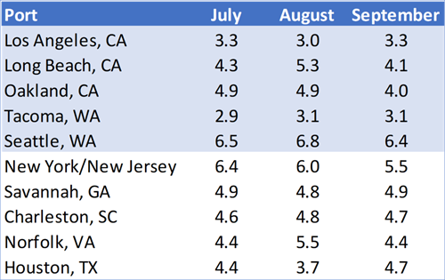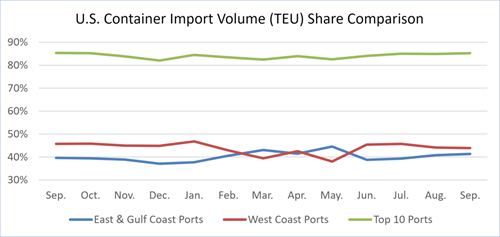 總體而言,美國前10大港口9月份集裝箱進(jìn)口量占總量的85.2%,比8月份略微增長了0.3%。