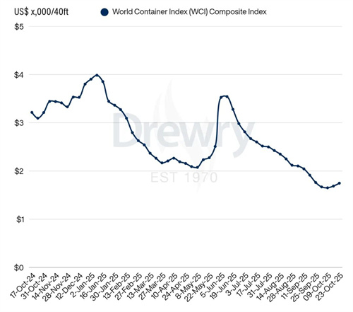 Drewry世界集裝箱運價指數(WCI)本周(截至10月23日)環比上周上漲3%,約為1,746美元/FEU。