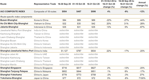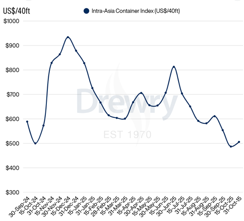 Drewry亞洲內集裝箱運價指數(IACI)在10月下半月上漲4%,收于506美元/FEU。IACI是亞洲區域內18條主要航線的現貨運價加權平均值,目前比2024年同期的水平低12%。