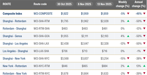 與此相反,上海至歐洲航線的運價則有所回升。上海至熱那亞航線運價上漲4%,至2193美元/FEU;上海至鹿特丹航線運價上升3%,至2028美元/FEU。亞歐航線的船公司正試圖推高現貨市場運價,宣布自11月15日起實施新的均一運費FAK(標準為每40英尺集裝箱3000至3650美元,以期在新一年度合約談判季開始前提振現貨運價水平。