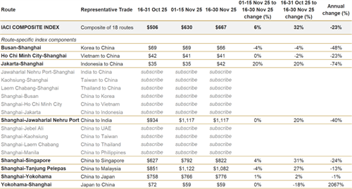 Drewry亞洲內(nèi)集裝箱運(yùn)價(jià)指數(shù)(IACI)在11月下半月環(huán)比上漲6%,收于667美元/FEU。IACI是亞洲區(qū)域內(nèi)18條主要航線的現(xiàn)貨運(yùn)價(jià)加權(quán)平均值,目前比2024年同期的水平低23%。