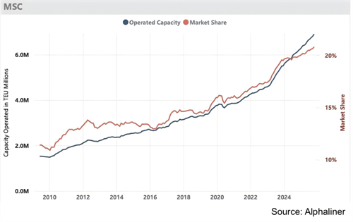 與此同時,Alphaliner數據顯示,地中海航運的運力達到709萬TEU,市場份額達21.3%。此外,地中海航運還持有118艘,總計210萬TEU新造集裝箱船訂單。