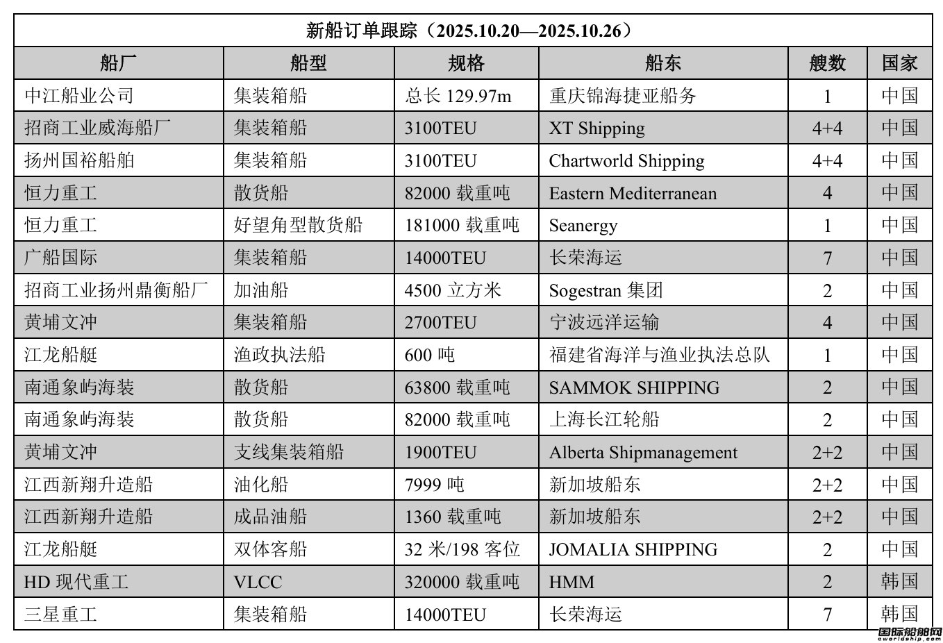 新船訂單跟蹤(2025.10.20—2025.10.26)