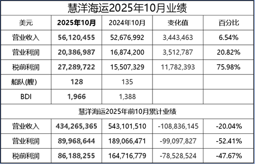 航運界網消息,慧洋海運發布2025年10月份營業數據;垩蠛_\確認出售最后1艘海岬型船。