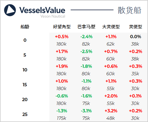 每周全球主流船型二手船交易信息,及VesselsValue(簡稱VV)售前估值。