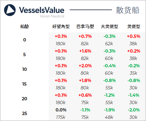 每周全球主流船型二手船交易信息,及VesselsValue(簡稱VV)售前估值。