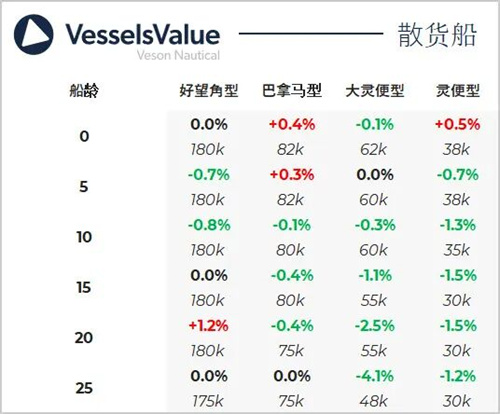 每周全球主流船型二手船交易信息,及VesselsValue(簡稱VV)售前估值。