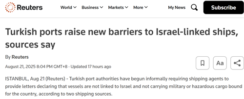 據(jù)路透社消息,近日,土耳其港口當(dāng)局收緊對(duì)涉及以色列航運(yùn)的管控。