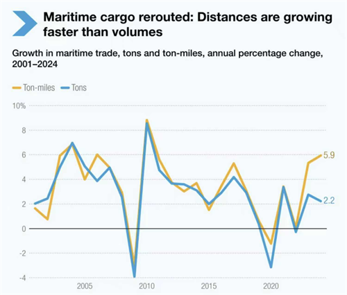 聯合國貿發(fā)會議(UNCTAD)在最新發(fā)布的《2025年海運回顧》中指出,2025年全球海運貿易預計僅增長0.5%。報告警告,地緣政治局勢、新關稅措施以及氣候新規(guī)的臨近,正在延長航程、推高成本,并給全球航運和物流供應鏈帶來長期不確定性。
