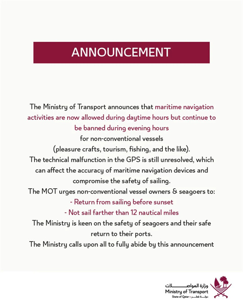 然而,影響GPS系統的技術故障仍未解決,當局警告導航精度持續受限。根據最新指令,卡塔爾交通部對休閑船只實施嚴格管控,要求其必須在日落前返港,且活動范圍不得超過海岸線12海里。