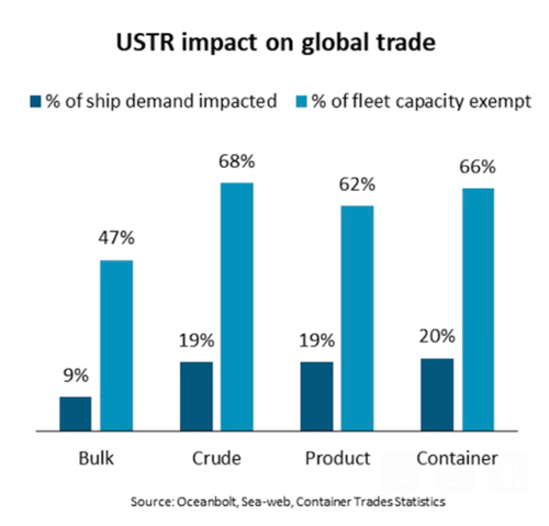 不過,從整體市場來看,這項政策的實際影響或許有限。今年以來,美國市場在各船型全球需求中的占比僅為9%至19%;而歷年統計顯示,僅有16%至24%的美國進出口貨運是通過這些可能被征費的船舶完成的。