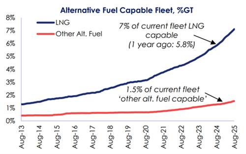 根據克拉克森的數據,整體而言按噸位計算,截至目前在運營船隊中能夠使用替代燃料或推進裝置船舶的比例已經提高到了8.6%,高于2017年的2.6%和2024年年初的6.5%。在現有總計2509艘替代燃料船舶中,包括1449艘LNG動力船、72艘甲醇動力船、143艘LPG動力船、732艘電池/混合動力推進船,此外還有268艘采用其他燃料。