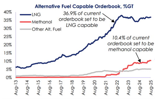 而在手持訂單中,替代燃料船舶占比更是達到了52.4%,高于2017年的10.9%和2024年初的48.6%。按噸位計算,手持訂單中36.9%為LNG動力船(1003艘),10.4%為甲醇動力船(340艘),2.0%為LPG動力船(141艘);此外還有約3.1%(約550艘)使用其他替代燃料,其中包括38艘氫燃料、64艘乙烷燃料、43艘氨燃料、18艘生物燃料和515艘電池/混合動力推進船舶,替代燃料船舶手持訂單總計2034艘。