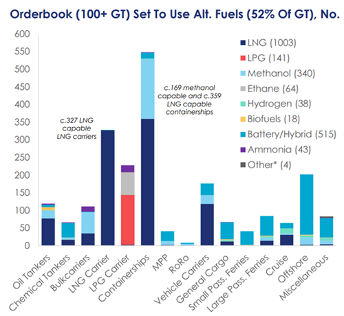 今年的替代燃料船舶訂單包括LNG動力船129艘1840萬總噸,甲醇動力船53艘610萬總噸,LPG動力船14艘60萬總噸,乙烷動力船4艘10萬總噸,以及電池/混合動力推進船舶86艘120萬總噸。