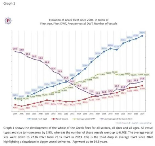 2024年,希臘船隊平均船齡增至14.6年,較2023年的14.3年略有上升。船隊整體增速放緩,而船東公司的整合趨勢仍在持續。2024年,希臘各型船舶總數凈增214艘。總體而言,船隊總載重噸位增加1380萬載重噸,增幅為2.9%。