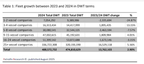 從絕對增量看,船隊規模凈增214艘,而2023年、2022年分別新增85艘、286艘。與此同時,希臘船東數量從592家微降至588家。從企業規模看,擁有25艘及以上船舶的船東數量首次達到60家,高于2023年的57家。