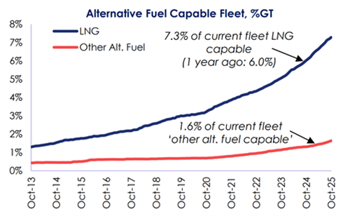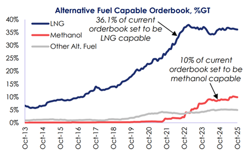 根據克拉克森的數據,整體而言按噸位計算,截至目前在運營船隊中能夠使用替代燃料或推進裝置船舶的比例已經提高到了8.9%,高于2017年的2.6%和2024年年初的6.5%。在現有總計2605艘替代燃料船舶中,包括1490艘LNG動力船、81艘甲醇動力船、147艘LPG動力船、760艘電池/混合動力推進船,此外還有285艘采用其他燃料。