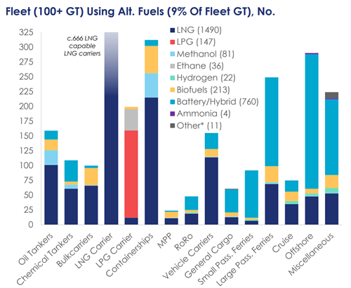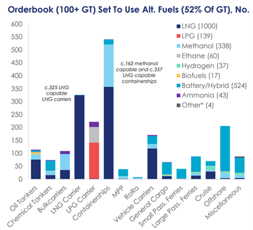 今年的替代燃料船舶訂單包括LNG動力船158艘2110萬總噸,甲醇動力船54艘620萬總噸,LPG動力船16艘70萬總噸,乙烷動力船4艘10萬總噸,以及電池/混合動力推進船舶110艘150萬總噸。