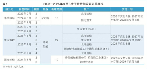 西芒杜鐵礦石項目正式投建后,幾內亞—中國航線的航運市場將迎來新的發展機遇,其中海岬型船和礦砂船的需求有望得到顯著提振。上海國際航運研究中心高級市場分析師邵斐曾向本刊表示,從幾內亞—中國航線的主流船型來看,海岬型船占據主導地位,該項目的投產將直接帶動這一船型的運輸需求增長。以17萬DWT級海岬型船為例,幾內亞往返中國的單程航程接近40天,一年可完成4.5個航次。若西芒杜項目年產的1.2億噸鐵礦石全部發往中國,僅滿足這一運輸需求就需要155艘海岬型船。值得關注的是,海岬型船在干散貨船隊中整體船齡相對年輕,25年以上船齡的船舶數量較少。但由于2010—2012年建造的船舶數量較多,這批船舶將在2030年后逐步進入老齡化階段,這也為新造船市場提供了潛在空間。克拉克森數據顯示,自2023年以來,韋立國際、中遠海運散貨運輸有限公司(中遠海散)、招商局能源運輸股份有限公司(招商輪船)3家主流干散貨運輸公司已敏銳捕捉到市場機遇,相繼在中國造船廠下單建造海岬型船和礦砂船(見表1),部分新船訂單更是為適配西芒杜鐵礦石運輸需求而規劃。