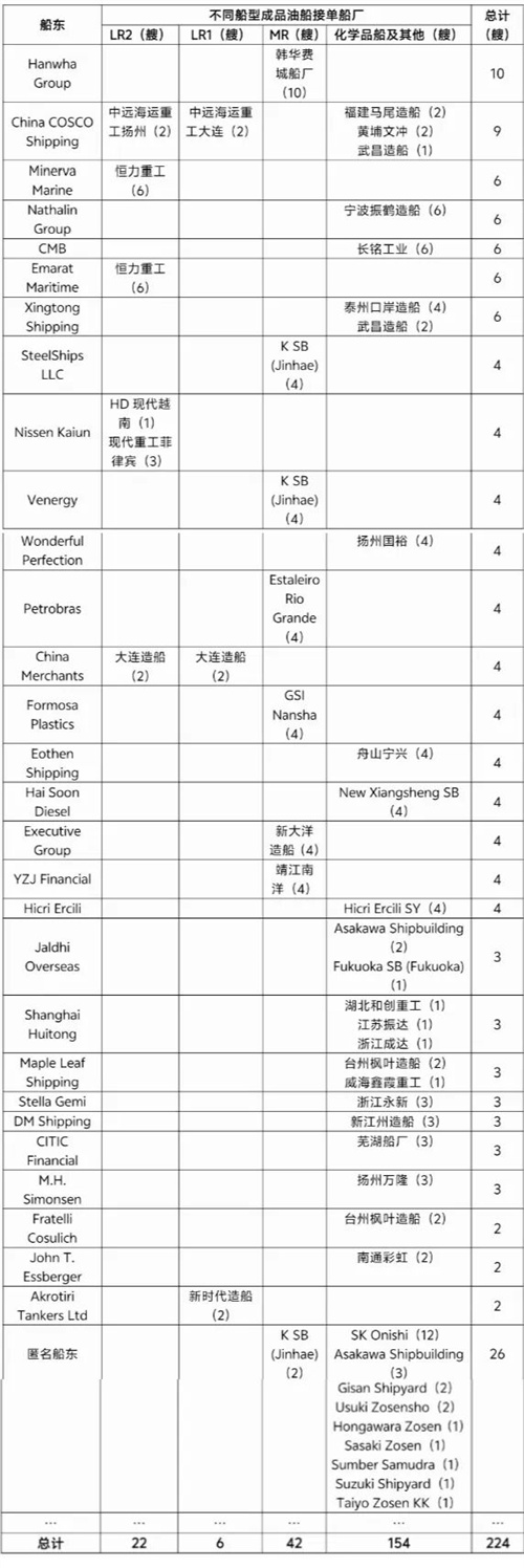 表2 2025年初至今全球成品油船主要下單船東及接單船廠(部分)