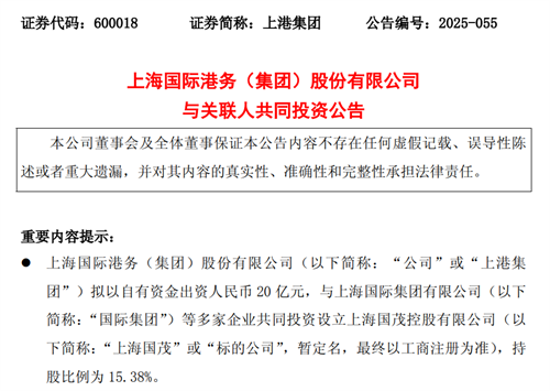 11月13日,上海國際港務(集團)股份有限公司(證券代碼:600018,證券簡稱:上港集團)發布公告,擬以自有資金出資人民幣 20 億元,與上海國際集團有限公司(以下簡稱:“國際集團”)等多家企業共同投資設立上海國茂控股有限公司(以下簡稱,“上海國茂”),持股比例為 15.38%。